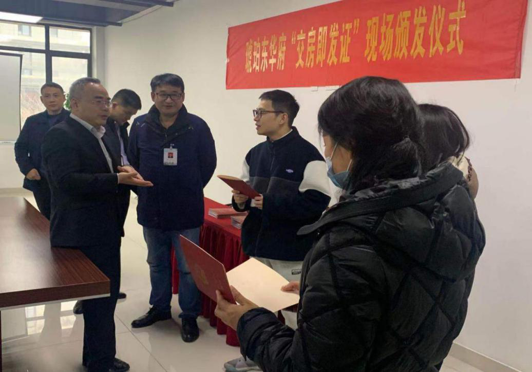 2021年1月21日上午10時(shí),琥珀?yáng)|華府項(xiàng)目舉行了“交房即發(fā)證”現(xiàn)場(chǎng)不動(dòng)產(chǎn)權(quán)證書(shū)頒發(fā)儀式,儀式由公司黨委委員、副總經(jīng)理王慶生主持,合肥市不動(dòng)產(chǎn)登記中心副主任王國(guó)堂、合肥市不動(dòng)產(chǎn)登記中心瑤海分中心主任韓斗泉等相關(guān)部門領(lǐng)導(dǎo)及部分琥珀東華府業(yè)主代表參加了此次發(fā)證儀式。